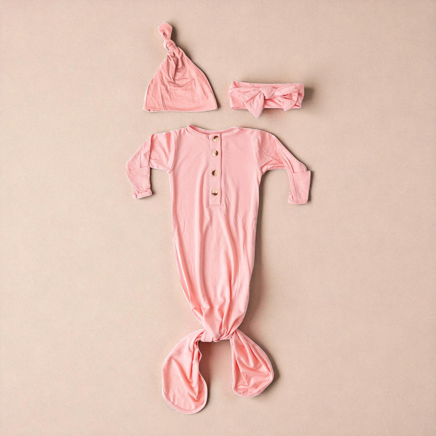 Knotted Baby Gown Set – Soft Modal Sleepwear With No Scratch Mittens & Hat